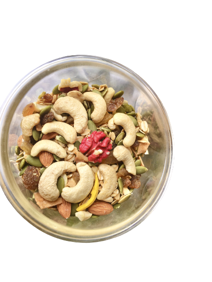 Granola of Vietfarm produces including: oats, grapes, coconut, mango, cashew nuts, almonds, red walnuts, zucchini seeds
